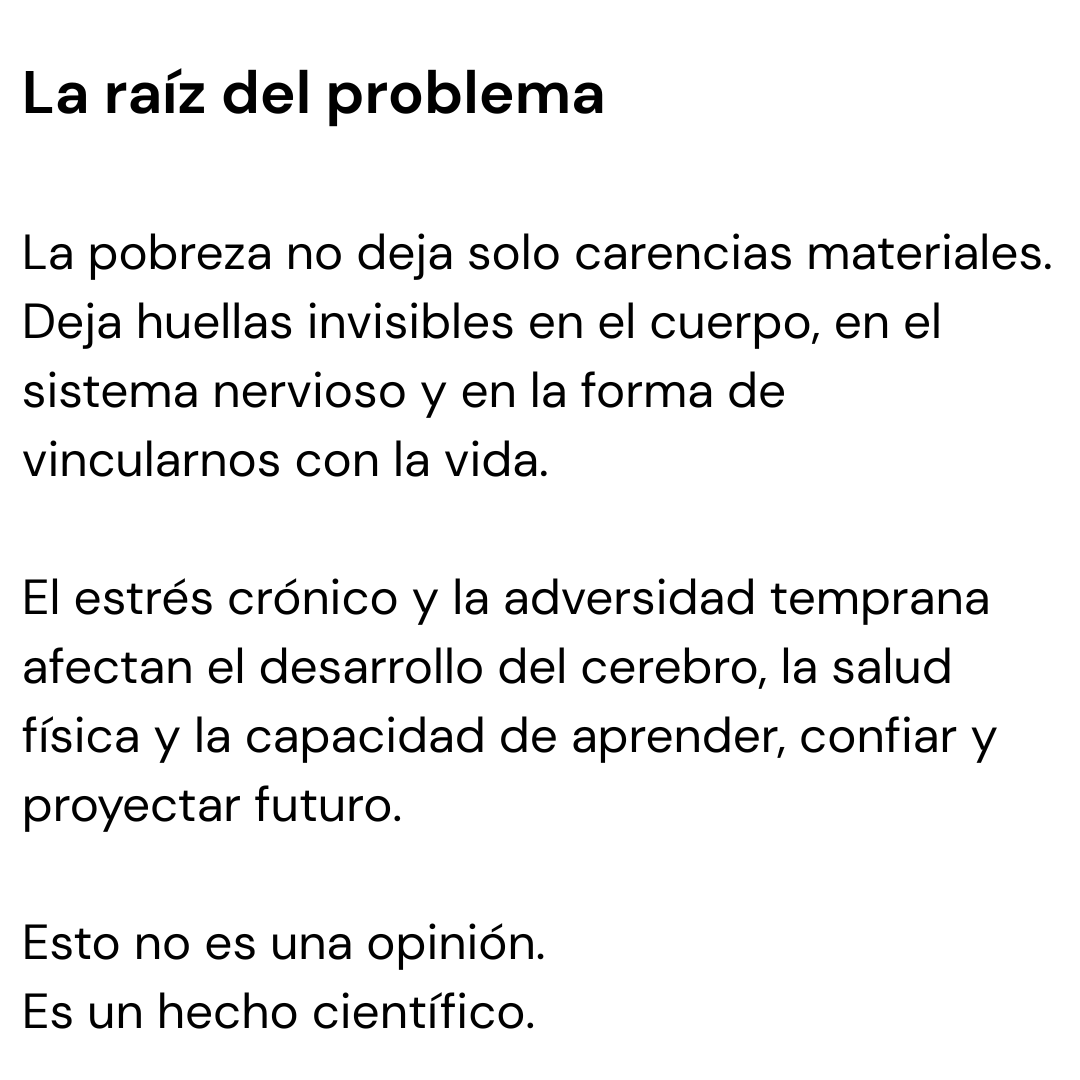 La ciencia es clara: la adversidad temprana y el estrés crónico afectan el desarrollo del cerebro, el sistema inmune, el sistema hormonal. Esas huellas no desaparecen solas. Se expresan después como enfermedad, dificultades de aprendizaje, problemas vinculares.